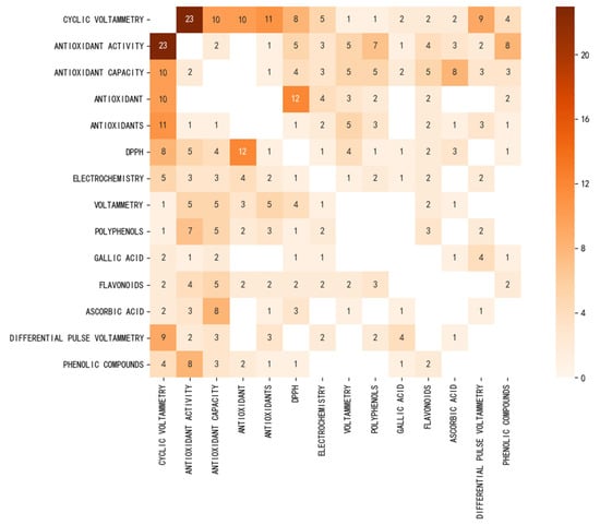 We further use the frequency of occurrence of keywords to make the confusion matrix between keywords (Figure 9). As can be seen from the figure, the most co-occurrence is between cyclic voltammetry and antioxidant activity, indicating that cyclic voltammetry is the most commonly used technique in electrochemistry to measure antioxidant activity. DPPH and cyclic voltammetry also have a strong co-occurrence, indicating that the two techniques can be applied to determine the antioxidant activity of the same substance or sample. DPPH free radical scavenging is a conventional detection technique that should be used as a reference method to measure the accuracy of the proposed electrochemical technology-based sensor. Some antioxidant names are also listed in this co-occurrence diagram, such as polyphenols, gallic acid, flavonoids, and ascorbic acid. The observations here are very consistent with the previous results in keyword analysis. In addition, differential pulse voltammetry also appears. This means that in addition to cyclic voltammetry, differential pulse voltammetry is often used to measure the antioxidant capacity of samples.