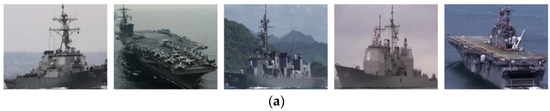 - In view of the small number of subclass images of each ship type, in order to enrich the data, we propose the use of computer simulation software to generate simulation ship images with different types and different angles, so as to expand training data. The main types identified in this paper are Arleigh Burke, Murasame, Nimitz, Ticonderoga, and Wasp. Some of them were selected from the third level of [10]. Because Murasame is similar to Arleigh Burke, it was also added to verify the effectiveness of our model.