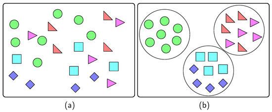 Data (a) before the partition and (b) after the partition with k-means clustering.