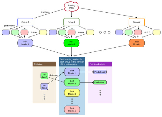 When machine learning is used for problem solving, a single model is constructed from the entire dataset. The k-means clustering algorithm in this study partitions the training data into disjoint clusters of similar data and multiple machine-learning models are then constructed, i.e., one model for each cluster. The grid search in Figure 2 is performed on each cluster as in Figure 4 to train each model separately and independently and determine the optimal hyperparameters of the model for each cluster. Learning through k-means clustering is referred to as learning with clustering in this study. Learning in Figure 2 without k-means clustering, i.e., learning the entire training data all together is referred to as learning without clustering.