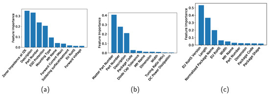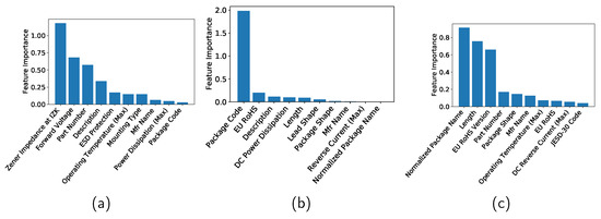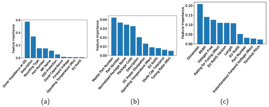 Feature importance of (a) Zener diodes, (b) varactors, and (c) bridge rectifier diodes when a decision tree is applied.