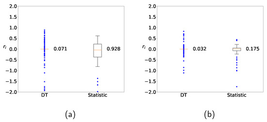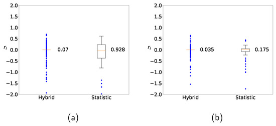 Figure 10 shows the distributions of in (9) by using the hybrid method (a) without clustering and (b) with clustering. Similarly to Figure 9, the range of the distributed values from the hybrid method is narrower than that from the naive statistic, and the result from the hybrid method with clustering is superior to the result from the hybrid method without clustering. Similar trends are observed for other machine-learning methods or other datasets as well (not shown), and it is empirically supported that clustering leads to improvement.
