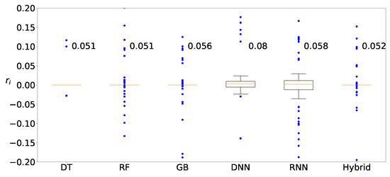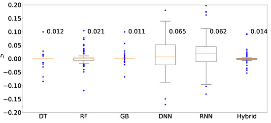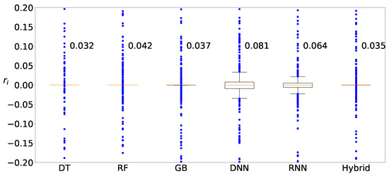 Next, we determine the machine-learning method that produces the best prediction result. Figure 11 shows the distributions of the deviation of the prediction from various machine-learning methods, DT, RF, GB, DNN, RNN, and hybrid, when clustering is applied to Zener diodes. Four machine-learning methods, DT, RF, GB, and hybrid, result in similar prediction distributions, whereas the results from two deep-learning methods, DNN and RNN, are slightly worse than those from the machine-learning methods. Figure 12 and Figure 13 show the results of the varactors and bridge rectifier diodes, and similar trends are observed. One of the reasons for the poor results from the deep-learning methods may be result from insufficient data. In fact, deep learning is superior to ordinary shallow machine learning if the number of data is large enough. However, the data for the current case study are insufficient and the ordinary shallow machine-learning produces better results than the deep learning in this study.