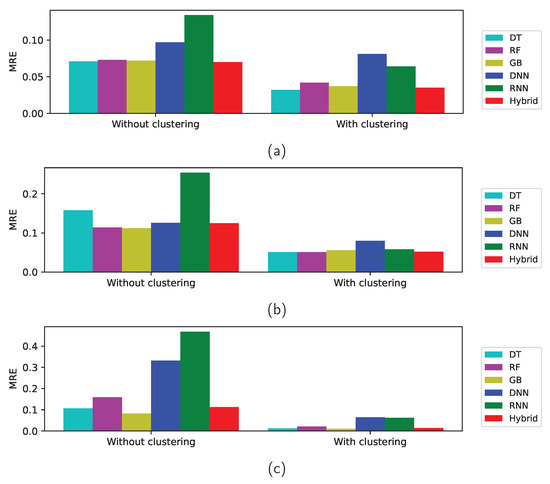 Table 9 lists the MRE error of the test data with and without clustering. The predictions from all the machine-learning or deep-learning methods with or without clustering are better than the naive statistic prediction and the four shallow machine-learning methods, DT, RF, GB, and hybrid methods produce better results than DNN and RNN for for all the three categories. Deep learning methods produce good regression accuracies in many applications, but they have difficulty in finding right parameters in this study owing to the lack of data.