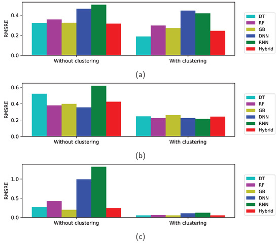 Table 10 lists the RMSRE errors of the training data with and without clustering. Similarly to Table 8, the errors from the naive statistic, DNN, and RNN methods are larger than the others and training with GB seems to overfit.