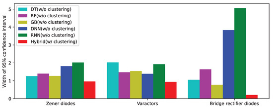 Table 13 lists the widths of the 95% confidence intervals of the predicted values using various methods. As shown in the Table 13, the size of the confidence interval of the hybrid method with clustering is much smaller than that of the method without clustering. Therefore, it can be inferred that the estimate using the proposed method with clustering is more stable and accurate. As an example, for the bridge rectifier diodes data, the width of the confidence interval of the predicted value using an RNN is 24 times wider, and in the case of using an RF, the width is times wider than that obtained by using the proposed hybrid method. Figure 16 presents the widths of the 95% confidence interval using a bar graph, which shows the variation of the prediction accuracy of various machine-learning methods. The bar corresponding to the proposed hybrid method with clustering (red) is shorter than the others for all the three categories, which confirms the superiority of the proposed method.