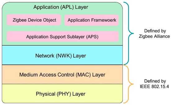 Internet of Things (IoT) is a network of interconnected objects where these objects/things transfer data among themselves. The recent development of wireless communication has prompted the IoT to grow multi-fold in the last few years. It has diversified application fields, including smart cities, home automation, industrial manufacturing, intelligent transportation systems (ITS), vehicular communication, and smart agriculture [1,2,3]. In all of these applications, wireless sensor networks (WSNs) are deployed to interact with the surroundings and perform the assigned tasks. WSNs consist of sensor nodes that communicate wirelessly to transfer data, are deployed in remote locations, and are battery powered. Thus, they have constrained power supplies and must operate on low power modes. Zigbee communication protocols is one popular standard used for such a low-powered wireless communication, based on IEEE 802.15.4 [4,5]. ZigBee is currently maintained by Zigbee Alliance and built on top of the IEEE 802.15.4 physical (PHY) layer and medium access control (MAC) layer, as depicted by Figure 1 [6]. The PHY and MAC layer defines the low-level network procedures, such as transmission, selection of channels, and operating frequency. The network (NWK) layer and the application (APL) layer are defined by the Zigbee specifications. The NWK layer defines the architecture of the network, routing protocols, and security and, thus, encryption and decryption of the transmission. The APL layer has three sub-layers, namely application support, application framework, and the Zigbee device object. The application support sublayer interfaces the NWK layer with the APL layer whereas the application framework forms the environment to host the application objects. On the other hand, the Zigbee device object sublayer allows advanced networking along with device and service discovery features [7].