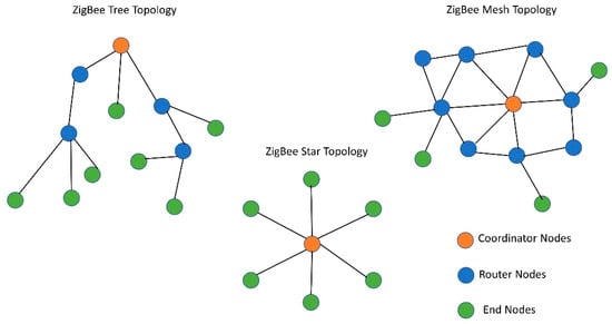 A Zigbee node in a network can be configured with three different modes: (i) coordinator, (ii) router, (iii) end nodes [17]. The coordinator is the central node of the network that acts as the gateway, and it is responsible for allowing any node to join the network. Data can be broadcast from the coordinator to every node of the network and information can be sent to any node from the coordinator. It can also change the configuration of any of the member nodes with over the air (OTA) programming. The function of the router nodes is to route the data from the coordinator to the designated end node or vice-versa. We should note that, they can also be equipped with sensors to sense and transmit the data to the coordinators. However, in this study, the routers were not equipped with any sensors to keep the number of packets and transmitting bytes the same while conducting the measurements with or without router nodes (single and multi-hop). This was done to make the comparison fairer with single and multi-hop communication. End nodes are edge nodes of the WSN and are usually equipped with sensors to interact with the surroundings. End nodes can be configured to deep sleep, cyclic sleep, and reserved mode to conserve the battery power [18]. Zigbee standard allowed for communication in three different topologies: (i) star, (ii) tree, and (iii) Zigbee mesh topology [19], as in Figure 2. A Zigbee star network consists of one coordinator and a few end nodes connected directly to it. A Zigbee mesh network is self-healing by nature and consists of one coordinator and multiple routers and end nodes. Routers can communicate among themselves and with the end nodes to route the data from the end node to the coordinator or vice-versa.