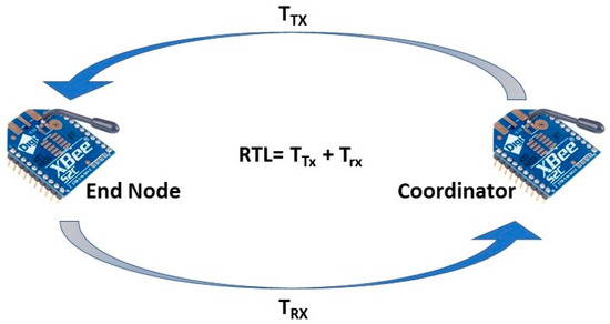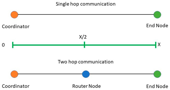As it is evident that even though there are a wide range of choices of Zigbee modules for different use cases, there core specifications and performances are very close to each other. XBee 3 and XBee 3 pro have higher programmable memories and can be tuned to higher Tx power, which improves the transmission range and affects the current and power consumption. However, when tuned to the same transmission power, they perform analogously with other modules, including XBee S2C [47]. For the ease of programmability, ease of integrability with sensors and microprocessors, XBee S2C is the module that this study focuses on. However, the analysis and study from this work can be generalized for the above-mentioned modules as most of those share the same specifications including the same/similar transceiver chipset. XBee S2C has an indoor range of up to 60 m, and all the tests were performed at 0–40 m distances. It can be tuned to three different transmit powers: 1 dBm, 3 dBm, and 5 dBm. Moreover, the user has the option to enable the boost mode, which would allow the modules to automatically switch to transmit power of 8 dBm when the link quality degrades. However, the boost mode is not considered in this study as it is not a stable state and longtime transmitting at this power level may damage the device. Outdoor link quality (RSSI) analysis is conducted in an open space by placing the coordinator node at one end and the end nodes at a distance ranging from 0 to 40 m from the coordinator. The outdoor experimental scenario is a parking lot allowing LoS, minimum Wi-Fi, and Bluetooth interference. For two-hop communication, the RSSI values are measured by placing one router node at an equidistance from the end node and the coordinator. For further illustration, the two-hop measurement setup for any distance is depicted in Figure 3. For multi-hop communication, Zigbee routing protocol is employed which is a modified version of ad hoc on demand distance vector (AODV). With this protocol, the node that wants to be connected initiated the communication and routes are maintained as long they are in use by the source node. Further details on Zigbee routing algorithms can be studied from [48,49,50]. For this work, the two-hop tests are conducted alongside single hop with only an RSSI measurement and round-trip latency analysis. This is because multi-hopping primarily affects these two parameters. Moreover, based on these two metrices, other metrices, such as PDR, throughput, overall energy consumption of the network, are also affected. For other tests, only single hop communication is taken into consideration. For two-hop communications, the network is configured to always choose the multi-hop for all the different distances. However, AODV routing protocol might not choose multi-hops for all the transmission distances based on network performances at that point. However, for two-hop tests with RSSI and round-trip latency analysis, multi-hopping is forced at all distances for fair comparison of single and two-hop communication. Moreover, these two tests are not focused on evaluating the routing protocol of Zigbee, rather they focus on how the performances may vary if the end node chooses two-hop instead of single hop at any given distance.