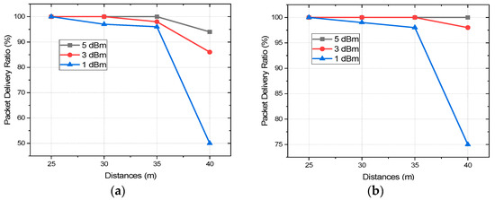 PDR vs. distances for different transmission power levels in (a) indoor and (b) outdoor environments.