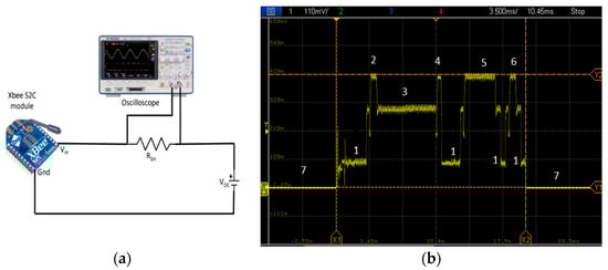 The energy consumption for each stage of the transmission is calculated with Equation (3) where I is the average current consumption, Rsh is the shunt resistor of 9 Ω across which the XBee module is connected, and T is the duration of that stage.