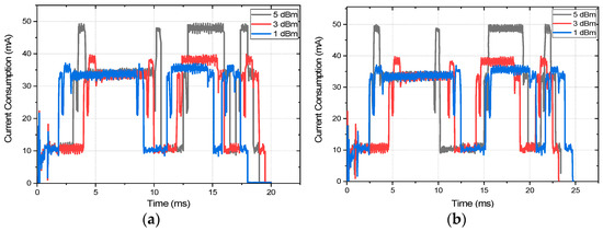 The current consumption captures at different Ptrans levels (a) without encryption and (b) with 128-AES encryption.