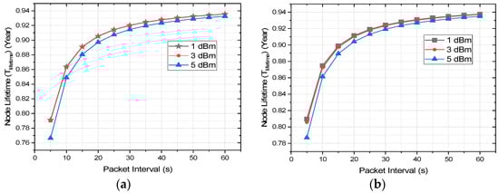 With 3 dBm, the PDR is 100% up to a transmission distance of 35 and 30 m, respectively, for outdoor and indoor environments. Moreover, this drops to 96% and 86% for outdoor and indoor environments, respectively, at a transmission distance of 40 m, which is decent for most IoT applications. As with very little increase of energy consumption from 1 to 3 dBm, the PDR improves radically, the 3 dBm transmission power level is recommended by authors for network optimization. To improve the PDR further with a 5 dBm PTrans level, the energy consumption increase will significantly decrease the overall network life dramatically. Thus, 3 dBm is chosen for the rest of the study and analysis. The impact of the transmission power level on the network lifetime would be much more obvious by analyzing the network lifetime of the considered XBee S2C module. The network lifetime of any node can be calculated from the current consumption and duration of each stage of data transmission, which is presented in Table 5 and Table 6. For calculating the network lifetime of any node, we formulated Equations (4)–(7) where Tactive is the total duration, Iactive is the total consumed current during the transmission of a single packet. The XBee module is configured to go to sleep immediately after the data transmission and wake-up after the predefined sleep time for the next transmission. The duration between two consecutive data transmissions is sleep time, which is configured by the user. The total number of transmissions in any given time depends on this user-defined sleep time, which is denoted by Tsleep. The current consumption during Tsleep is minimum, which is 0.6 mA for the XBee S2C module and is presented by Isleep in Equation (6). The total lifetime of a node is calculated by Equation (7) and is presented with Tlifetime where Bcapacity is the capacity of the DC source of the node in mAh [53]. The node lifetime is calculated for a battery of 5000 mAh capacity with different Tsleep intervals for a comparative analysis of different transmission power levels of 1, 3, and 5 dBm. The network lifetime for different sleep intervals, i.e., packet intervals and transmission power levels with a packet size of 30 bytes and battery capacity of 5000 mAh, is presented in Figure 8.