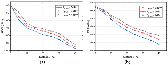 The link quality of transmission in terms of RSSI with different transmission power levels, distance, and deployment environment: (a) indoors and (b) outdoors.