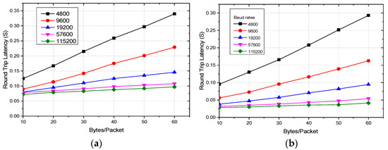 Baud rate is another important parameter that can influence the performance parameters significantly. In particular, the latency and throughput greatly depend on it. The bit rate of the transmission greatly depends on the baud rate and there is a very close relationship between them [19]. The baud rate is the transmission rate of the signal unit or symbol, whereas the bit rate is the transmission rate of the bits. This can be expressed with Equation (1), as follows: