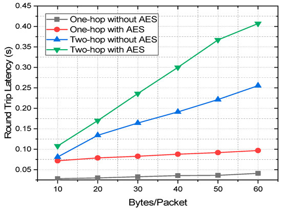 Therefore, even though the increased number of hops increases the reliability in terms of link quality and delivery ratio and also increases the transmission range, it also significantly increases the latency of the communication. Therefore, deploying more router nodes increases the reliability, PDR, and transmission range, but affects the latency performance drastically. Thus, multi-hop communication is not suitable for real-time applications where a delay is very critical. We can also analyze that the encryption also worsens the latency performances if not as worse as the increase of the number of hops. The 128-bit AES encryption in Zigbee increases the latency by 153.52% and 134.87% for 10 bytes/packet and 60 bytes/packet, respectively, for one hop and the increment is 32.84% and 59.35%, respectively, for two-hop.