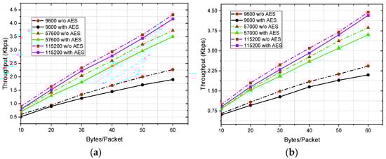 The baud rates define how fast the data transfers, i.e., the data transfer rate through serial ports. Thus, it is one of the primary and important factors of the overall throughput of communication. However, other parameters, such as the size of the packets and the deployment scenario, which controls the transmission medium and LoS, may limit the data throughput significantly. The data throughput of the Zigbee protocol can reach up to 250 Kbps depending on the number and types of nodes, transmission medium, operating frequency, and allocated bandwidth [54]. However, it greatly varies and is reduced down to 4.5–5 Kbps in a real-world scenario for point-to-point communication with actual transceivers as presented by [55]. This study by Piyare et al. considered only the baud rates and packet size as the performance parameters of throughput. However, it is also important to understand how the throughput changes with deployment scenario and the data encryption. Thus, our work performed these studies and presents a comprehensive analysis of throughput. For indoor scenarios, the study was performed by deploying the coordinator node at C1 and the end node at E30, which was at 30 m distance from each other as depicted by Figure 4. For the outdoor study, the deployment scenario was the same, but it always maintained a direct LoS and was implemented in an open parking lot to experience usual outdoor interference. Figure 14 presents the throughput vs. packet size at three different baud rates—9600, 57,600, and 115,200 for two different deployment scenarios. The study shows that the throughput performances of non-encrypted communication are slightly better than that of encrypted communication for both indoor and outdoor deployment. This is because of the increased data overheads due to encryption and also because of the additional time, it takes for encrypting and decrypting the data, which is evident from the current consumption and latency study as presented earlier in Section 4.1.2 and Section 4.3. On the other hand, transmission throughput is highest for the highest possible baud rate of 115,200 with the module XBee S2C for all the different packet sizes and deployment scenarios and it is lowest for the lowest considered baud rate of this study, which is 9600. Thus, the highest possible baud rate that is supported by the network devices is always preferred. For 10 and 60 bytes/packet with 115,200 bps, AES encryption decreases the throughput by 13.92% and 3.84%, respectively, for indoor deployment, which is 8.89% and 2.77%, respectively, for outdoor deployment. It is evident from the analysis that the percent decrease in throughput due to encryption is significantly improved for larger packet sizes for both scenarios. This happens as the data overhead for the encryption remain the same even though the encrypting and decrypting times vary with the variations of the packet sizes. It is another important aspect and interesting topic to study how the throughput is affected by the indoor deployment i.e., the non-LOS medium, multi-path propagation, and interference of the co-existing technologies, such as Wi-Fi and other RF technologies on the same ISM band. The throughput increases by 8.89% and 3% for 10 and 60 bytes/packet, respectively, when the network deployment scenario switches from indoors to outdoors for non-encrypted communication, which is 13.92% and 4.08% for encrypted communication. However, the overall throughput of the network can be increased significantly by deploying more router nodes, but this will increase the latency and the overall network cost. This is the tradeoff of the throughput and latency, which plays a great role in Zigbee network designing.