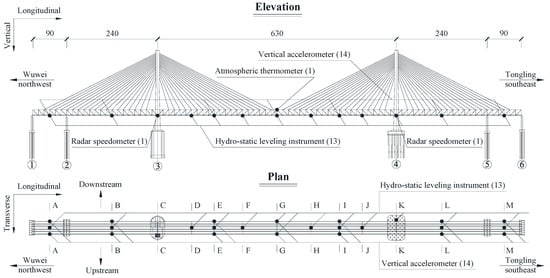 The case study is a long-span cable-stayed railway–highway combined bridge on the Changjiang river in Anhui, China. As indicated in Figure 1, the total length of the bridge is 1290 m, with a continuous span configuration of (90 + 240 + 630 + 240 + 90) meters; the main span of the bridge is 630 m. This bridge adopts the structure type of three girder trusses along the transverse direction and three cable planes along the longitudinal direction. The center of the three main trusses of the girder is 17.1 m apart along the transverse direction. The height of the trusses of the girder is 15.5 m, and upper and a lower orthotropic box steel bridge decks are set for the highway and railway respectively. The lower layer of the girder consists of two 250 km/h high-speed railway tracks on the downstream and two 160 km/h fast railway tracks on the upstream. The upper layer of the girder consists of six lanes of highway. As of the date of the monitoring data, all highway lanes and the downstream high-speed railway tracks were opened to traffic, while the upstream fast railway tracks were not. The number of carriages of high-speed trains on these railway lines is only 8 and 16. Two bearings are set on each pier to support the girder; the downstream bearings of each pier resist the vertical and transverse motion, while the upstream bearings of each pier resist the vertical motion. The two towers are both 212 m high. A total of 8 longitudinal viscous dampers are set between two towers and the girder (near the bearings) to resist the longitudinal impact of velocity greater than 0.5 mm/s (e.g., earthquake or the braking force of trains and vehicles). The two towers and four piers of the bridge are set on pile foundations with different depths.