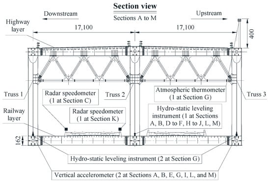 Figure 1 and Figure 2 indicate the deployment of monitoring sensors for the representation of bridge performance in this paper. The deformation and dynamic performances are two important items for the bridge during operation. Hence, the deflection and acceleration responses are selected as study objects to represent the bridge deformation and dynamic performance. A hydrostatic leveling instrument is used to measure the deflection (namely the quasi-dynamic vertical displacement) of the bridge. In each of Sections A, B, D–F, H–J, L, and M, one hydrostatic leveling instrument is set at the joint of the middle-truss rod and lower bridge deck. In the Section G, two hydrostatic leveling instruments are set at the joints of two side-truss rods and the lower bridge deck. Considering that only the two downstream high-speed railway tracks were open to traffic before the last day of the data used in this paper, all deflection data of Section G take the measured data of the downstream hydrostatic leveling instrument of Section G. In Section K, a hydrostatic leveling instrument is set on Pier 4 as the datum point for the whole hydrostatic leveling system. Two vertical accelerometers are set at the joints of two side-truss rods and the lower bridge deck in each of Sections A, B, E, G, I, L, and M. An atmospheric thermometer is set at the top of the truss in the Section G to measure the atmospheric temperature and humidity. Two radar speedometers are set near the two downstream high-speed railway tracks in Sections C and K to measure the speed of each traversing of trains on the bridge; correctly setting the measuring angle of the radar speedometer can easily accomplish the task of just measuring the speed from the train traversing its installed track. The sensing details of the above types of sensors are indicated in Table 1. The data transmission and power supply of all sensors uses the wired method. A data room is set for storing data near the bridge site. The sensors′ deployment and optimization are the important parts of the SHM [44]. The sensor deployment of the case study bridge is optimized by the dual driving of mechanics′ knowledge and monitoring experience, but it is not the focus of this paper and is not described here.