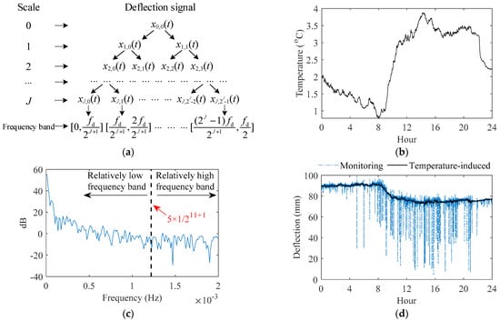 Determination of temperature-induced deflection by wavelet transform: (a) decomposition tree of signal by J-scale wavelet packet; (b) temperature data; (c) frequency spectrum of temperature data; (d) deflection data and its temperature-induced part.