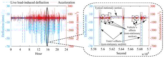 Based on the characteristics of the signal of train-induced and vehicle-induced response, the train-induced response and the vehicle-induced response can be effectively distinguished; then, the corresponding non-stationary sections can be automatically extracted. First, the sections of the time series signal of live load-induced deflection are cut out automatically using sliding windows, checking whether the absolute value of the minimum of each cut-out section of live load-induced deflection is higher than the empirical threshold of height. Then, if the absolute value of the minimum of some cut-out sections of live load-induced deflection is higher than the empirical threshold of height, we check whether the data on train speed at the same time period is at the normal range of speed of the high-speed train (the data of train speed will equal zero when no train traverses the bridge); which radar speedometer the train speed data belongs to needs to be recorded. Finally, if the data of train speed from one of the radar speedometers is at the normal range of speed of the high-speed train (each radar speedometer only records the speed of train in its installed track), the corresponding cut-out sections of the live load-induced deflection, acceleration, train speed, and temperature at the same periods can be judged as the train-induced sections. Each cut-out section records its time; if several adjacent sections are judged to be non-stationary sections, and they have the repeated minimum value of the train-induced deflection, only the middle one is extracted.