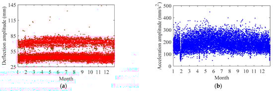 Amplitude of each non-stationary section of train-induced response at Section G in one year: (a) deflection; (b) acceleration.