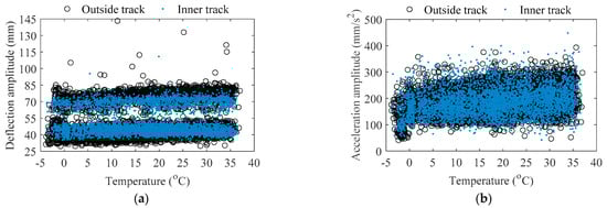 Amplitude of train-induced non-stationary response versus temperature at Section G: (a) deflection; (b) acceleration.