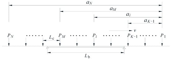 Lb is the length of the main span of the bridge, and Lc is the length of a single train carriage. The loading model of the train traversing the bridge can be simplified as shown in Figure 7. N is the total number of train carriages, K − 1 is the last load leaving the bridge, and M is the last load on the bridge. K − 1 should be greater than or equal to 0, and M should less than or equal to N.
