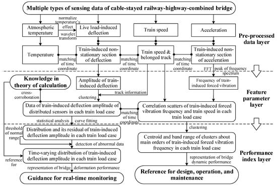 According to the above analysis, the right source of sensing data and feature parameters for representing the bridge deformation and dynamic performance was determined, and their representation methods based on multisource sensing data and theoretical calculation can thus be determined. An effective and practicable method is proposed as indicated in Figure 9. The framework of the proposed method consists of three layers, as follows.