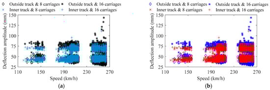 Figure 10 indicates the clustering results of the train-induced deflection amplitude by hierarchical clustering, and a comparison is made by the k-means clustering [39]; the process of clustering only uses the data of train-induced deflection amplitude, but for cross-corroborating with the results of theoretical calculation in Figure 8a, the data for train speed is also given. The data of the outside track and inside track is clustered respectively, and the depth of hierarchical clustering is set to 10. As indicated in Figure 10, the data in the cases of the outside track and inside track are both divided into two sub-clusters; they can accurately describe the theoretical characteristics of the two types of cases of 8 and 16 carriages, and the clustering results by hierarchical clustering are consistent with the results of k-means clustering. For data points close to the boundary of the two clusters, a small amount of data may be misclassified, and as the amount of data accumulates, this error will be reduced to a low level.