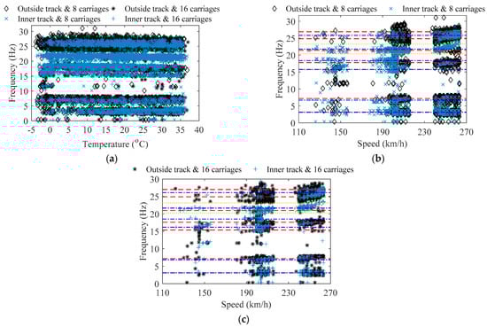 Frequency stability of the train-induced forced vibration: (a) influence of temperature; (b) influence of train speed in the cases of 8 carriages; (c) influence of train speed in the cases of 16 carriages.
