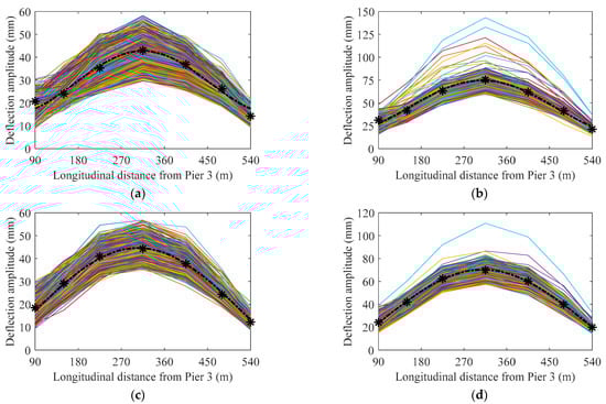 Based on the classified results of the train-induced deflection amplitude data in the four cases of train load, and the one-to-one matching relationship between several deflection sensors along the girder of the main span, Figure 12 indicates the distribution lines of train-induced deflection amplitude along the main span of the bridge based on one year′s data of train-induced deflection amplitude in the four cases of train load. The fitting curve of the distribution for the centroid of the data from each sensor is established using the Fourier series: