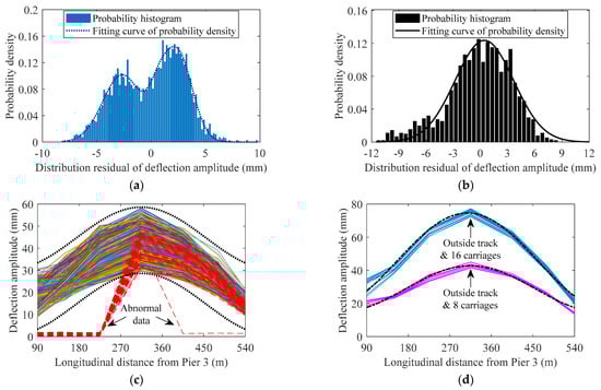 Based on DCtdf and a certain quantile of the CDF of DRtd, the normal range of the distribution of the train-induced deflection amplitude during the bridge operation can be determined. Taking the outside track and 8 carriages case as an example (as indicated in Figure 13c), the upper threshold of the normal range equals the DCtdf plus the 0.95 quantile of the CDF of DRtd plus three times the standard deviation of DRtd, while the lower threshold equals the DCtdf plus the 0.05 quantile of the CDF of DRtd minus three times the standard deviation of DRtd. Here, the multiple of three of the standard deviation can be changed according to different bridges or different deterioration states of bridges; it needs to be dynamically updated when using the proposed method. The calculated upper and lower thresholds (dotted curves in Figure 13c) of the normal range of the distribution of the train-induced deflection amplitude during the bridge operation can be used to detect the abnormal signals (data missing, etc.) or extreme traffic load. For example, dashed lines in Figure 13c present the characteristics of the distribution of train-induced deflection amplitude under the situation that part of sensors′ data are missing and part of sensors′ data are collected normally; the abnormal data is out of the lower threshold of the normal range.