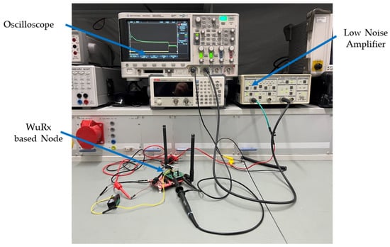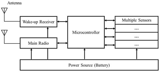 A sensor node is typically built out of antennas, WuRx, main radio, sensors, energy source, and microcontroller, as shown in Figure 1. The WuRx, which is an additional RF reception part, has its own antenna in order to receive only WuPt. The WuRx is configured by the microcontroller. The main receiver is used for the communication of data packages when the sensor node is in active mode. During standby, the WuRx is typically the only active component in the circuit. The WuRx analyses the incoming WuPt in order to validate the address. In the case of address matching of WuPt and WuRx, the WuRx sends an interrupt signal to the microcontroller to wake up.