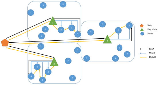 To return to the description of an individual cluster, as shown in Figure 2, we go into the formation in more detail. It should be noted that each cluster is assigned to a single Fog Node, to which eight sensor nodes are assigned. The Fog Node is the only network participant that enables communication between the sink and the individual sensor nodes of a cluster. However, data communication within a cluster is possible via multi-hop. This means that the individual sensor nodes can communicate with each other and send data packets to the Fog Node using cluster nodes as relays.