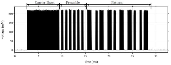 In our approach, wake-up signals consisting of carrier burst, preamble, and address pattern are used and shown in Figure 4. We assign WuRx addresses made up of a pattern of 16 bits to the sensor nodes equipped with a WuRx. The first 8 bits of the address represent the assignment to a cluster. The remaining 8 bits represent the unique address of the individual sensor nodes within the cluster. This results in a two-part address for multicasting. In order to use the WuRx address required for multicast wake up, the Fog Node accesses a table in which the multicast WuPt addresses are stored. It should be noted that 8 sensor nodes with WuRx are assigned to each cluster. This means that for each of the sensor nodes, there is a unique assignment of the rear 8 bits of the WuRx address.