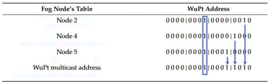 To illustrate this, based on the scenario outlined in Figure 2, in the first cluster using two cluster nodes as relay, Figure 5 is given. It can be seen that the Fog Node needs to wake up sensor nodes 2 and 4 for the data communication of cluster node 5, as these nodes must act as relays. This results in the address to be used for the WuPt for the Fog Node. According to the previous description, the bit corresponding to cluster 1, i.e., bit 8, is now set in the multicast WuPt and highlited in the Figure with the blue outline. To wake up the individual sensor nodes 2, 4, and 5, bits 1, 3, and 4 are set to 1 in the rear half of the address pattern according to the assignment as illustrated with the blue arrows. This will generate the multicast address shown in the graphic.