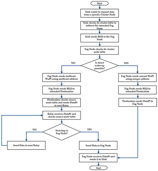 The key idea of the proposed method is that the sink performs transmission scheduling while the Fog Node uses a multicast strategy to wake up nodes for asymmetric data communication. The process is depicted in the Algorithms 1 and 2 and summarised as a flow diagram shown in Figure 6.