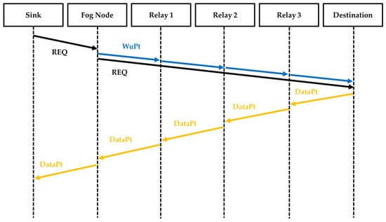 Based on the frequent interactions, the sink and Fog Node are main powered. At the time that a packet is to be exchanged, the sink transmits a Request Packet (REQ) to the Fog Node, which sends a Wake-up Packet (WuPt) to start Data Packet (DataPt) transmission. To improve the communication in time and energy aspects, we have integrated a multicast wake-up, which allows a simultaneous wake-up of a specific group of nodes. Therefore, the Fog Node can use a high data transmission power for directly reaching the destination node as well as the nodes acting as relays.
