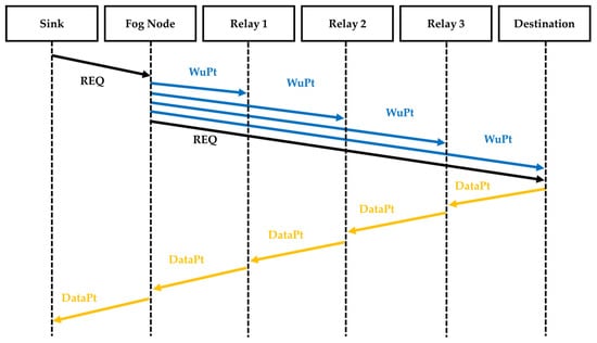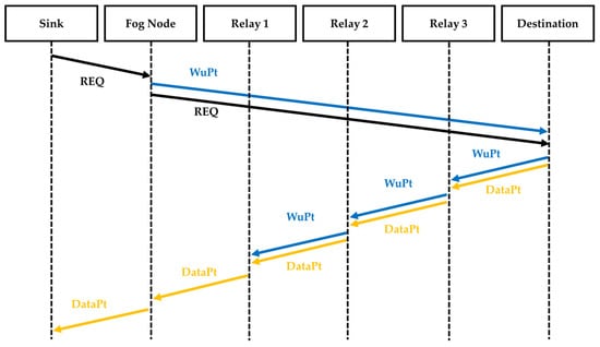 The work published in [28] is the Load Balancing Parent Selection (LoBaPS) protocol that supports opportunistic parent selection. In this strategy, the WuPt contains information about the node’s own rank (in a layered topology) together with a unique application ID (enumeration of WuPts). Each node in the communication range of the sender will receive this WuPt and compare the received rank with its own rank, and only wakes up its main radio if the former is higher than the own rank. In this case, each sensor node receives the DataPt sent by the source. However, only the sensor node that has the shortest CSMA (Carrier Sense Multiple Access) backoff forwards the WuPt followed by the data packet. The significant disadvantage of this strategy is the amount of energy wasted in listening mode when all the feasible successors wake up their main radio. Since only one sensor node per rank is included in the data forwarding process, but all sensor nodes in this rank receive the WuPt as well as the data packet, this leads to significant energy consumption. In addition, the most reliable route is chosen every transmission round. This leads to an uneven distribution of energy consumption and, therefore, most used nodes acting as relays can prematurely run out of power. In contrast, the approach we have developed has the advantage that sensor nodes, which are actually necessary for data forwarding, are specifically awakened. As the entire communication route is already known, it enables the Fog node to realise a time-efficient and energy-saving wake-up and data transmission.