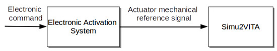 On Simu2VITA, modeling is restricted to mechanical forces and torques acting in the vehicle and generated by its actuators. Therefore, an eventual electronic activation system of an actuator would have to be attached externally to the simulation block, as shown in Figure 1. A typical case is the translation of a PWM input signal to the expected thrust input signal of a propeller.