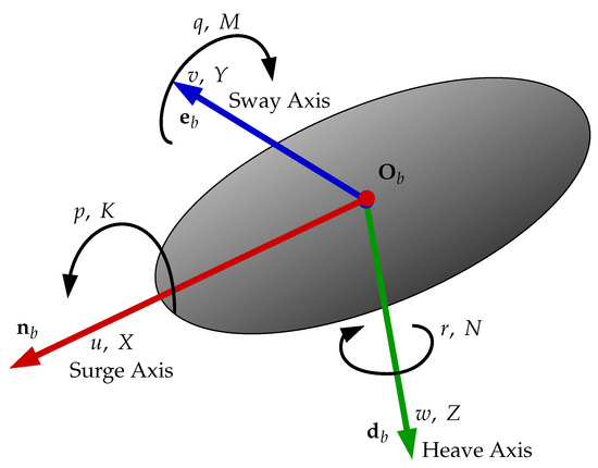 Each axis of the body frame is named according to the nomenclature defined by the Society of Naval Architects and Marine Engineers (SNAME) [15]. The vector is named the Surge Axis, is the Sway Axis and is the Heave Axis. The vector represents the linear velocity of the vehicle written in respect to its own body frame and the components in each axis following the Surge, Sway, Heave order. The angular velocity is , with each component being the gyros around each axis. Both vectors can be put together in vector . The forces and torques working on the vehicle body are all put in one single vector , with X, Y and Z being the force components, and K, M and N being the torque components.