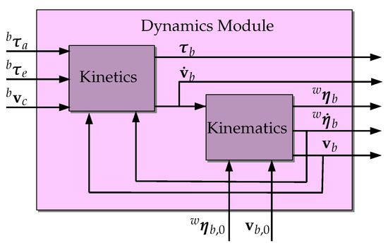 implicitly assuming the water current to be constant and irrotational [17]. This assumption is based on the premise that the UUV is not in an environment with currents that would generate perturbations in its torque state components, thus not leading it to rotate. This would be different if the vehicle was considered to be in an environment in the presence of waves. Figure 3 shows the internal flow of information, input, and output of this module. Observe that here, we also present the initial state vectors and as inputs to the Kinematics part.