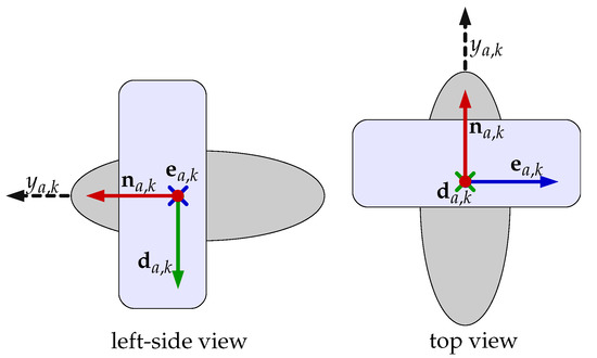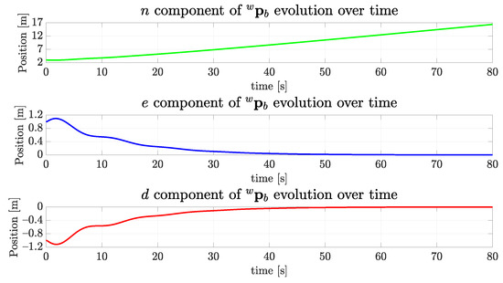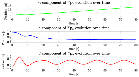 - The pose of the vehicle written with respect to (w.r.t.) the frame,where is the position and is a unit quaternion [16] describing the orientation of the vehicle with respect to . In addition, , where n, e and d are the three Euclidean components in the frame. The quaternion has its real part as its first component and the imaginary part encapsulated in . Notice that quaternion vector can be interpreted as “orientation of frame in respect to frame ”.