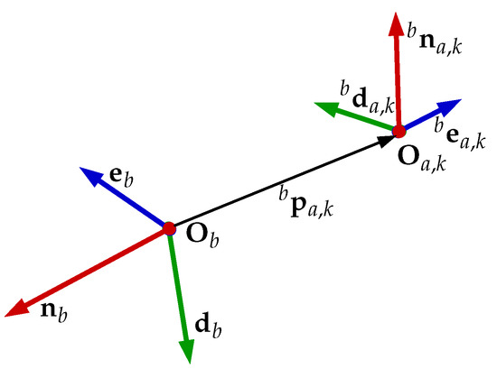 At this point, it is necessary to define the notation regarding vectors, matrices and linear transformations used herein. A vector that is from some frame is shortly written as or , and if the same vector has to be transformed yet to another frame , then it is denoted . A matrix P that represents a linear transformation from frame into frame is written as . Therefore, the expression linking and is