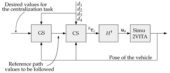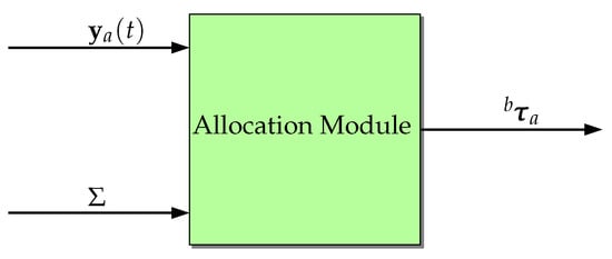 The Allocation Module task is to transform the output of the modeled actuators into forces and torques inputs of the vehicle described by , i.e., a function with being the number of actuators contributing to the generation of forces and torques in all six degrees of freedom. Commonly, this transformation is linear, and so it is in our design. This linear transformation is firstly considered static, and later, a time-variant possible solution is shown. Equation (21) shows the static case transformation,