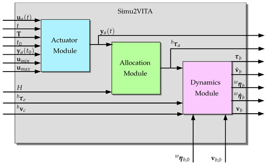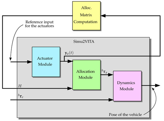 Starting with init_actuator_time, it receives a column vector containing the time an actuator will start receiving inputs, while the k-th element references the k-th actuator time to start. The simulation_time input enables an external clock to be used; for example, if one would like to control the vehicle in Simu2VITA using the ROS [37] network and its clock, in this case, the simulator makes the first value received as the base time and the simulation internal time is in reference to that base time. The output vehicle_resultant_forces is equivalent to the right hand-side of Equation (19) multiplied on the left by . The other inputs are: