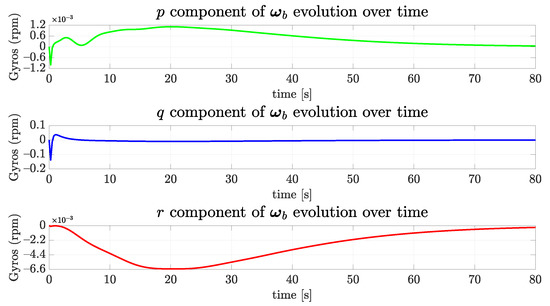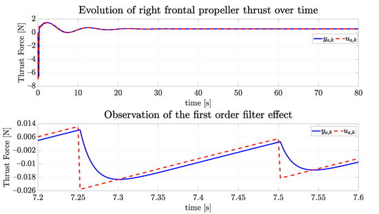 Observe that H can be time-dependent if the vehicle has movable actuators, for instance, a rotating propeller or even a fin for roll and pitch maneuvers. These rotating and movable actuators can be also modeled in the actuator module as will be shown in Section 3.1.4, but H will need to be calculated outside the simulator and this output fed back into Simu2VITA. For the simple case of a rotating propeller, the procedure we presented is the basis, with just the constant changing orientation needing to be tracked; see Figure 7. For fins, perhaps a non-linear approach is needed, and the final must be fed back directly using the input of the Dynamics Module, as the Allocation Module internal machinery expects a matrix to perform a linear transformation, in this case , i.e., the Allocation Module is bypassed. A future refining is to turn without the need for this bypass for the non-linear case of force allocation.