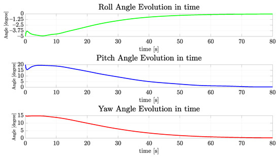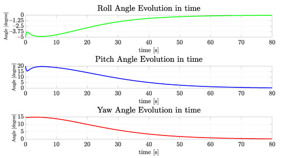 Figure 24 exhibits the evolution of the orientation over time, where roll and pitch remain in a well-bounded box around zero, also the yaw track and the desired yaw angle remains around it.