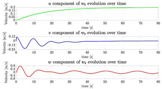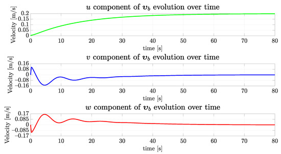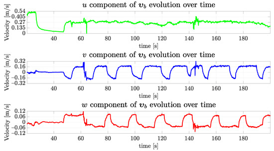 Last, observe in Figure 26 that the forward velocity is around 0.27 m/s, which is 0.02 m/s above the desired forward velocity at m/s for the real experiment. As expected from Figure 25, there was expressive speed in the vertical direction of the vehicle. The velocities were measured using the DVL sensor A50 from Waterlinked [35] attached to the bottom of VITA1 pointing downwards.